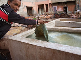Közben megbeszéltük, hogy akkor merre menjünk. A timár szuk, a bőrkikészítő műhelyek volt a célpont. Gavin-nek van térkép a telefonjában, ami arra volt jó, hogy legalább az irányt láttuk, hogy jó felé megyünk-e, mert azok a pici utcák azon sem voltak mind feltüntetve. Egy idő után hozzánk csapódott egy srác, aki felajánlotta, hogy elvezet a műhelyekhez. Ami jó is volt, mert magunktól még a telefon segítségével sem találtuk volna meg. Ott előkerítette nekünk azt az embert, aki kinyitotta a megfelelő kaput, majd körbekalauzolt bennünket. A kapuban kaptunk egy-egy köteg menta levelet, amit a bűz elől az orrunk alatt kellett volna tartani. De már nem volt az a nagyon meleg, így az az iszonyatos gyomorforgató bűz, amiről a könyv is írt, illetve mások elmondásából is hallottam, egyáltalán nem volt annyira gáz, simán fényképezgettem, és a mentacsokor sem hiányzott az orrom alól. Itt aztán szép kis „belépődíjat” elkértek, 150 MD volt, de legalább ezt is láttuk. A végén felkísért bennünket egy boltba is, de vásárolni egyikünk sem akart, így onnan gyorsan le is léptünk.